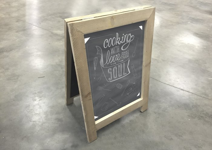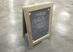 Eén van onze toppers is een robuust en mooi uitgevoerd krijt stoepbord. De onderzijde van de poten zijn voorzien van rubberen dopjes tegen waterschade en overige beschadigingen aan het hout. Het stoepbord is eenvoudig te verplaatsen en in te klappen en beide zijden zijn beschrijfbaar met krijtbord stiften. Doordat dit bord met de hand wordt gemaakt, kan het in diverse gewenste formaten geleverd worden.