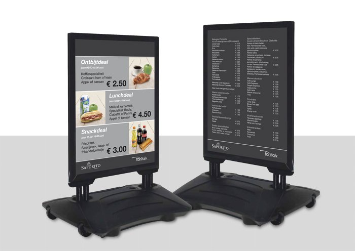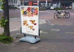 Zet een stoepbord voor de deur van je winkelpand of eetgelegenheid en elke voorbijganger kijkt ernaar. Dit is misschien wel de meest gemakkelijke manier van buitenreclame: u hoeft alleen maar de poster voor elke nieuwe actie, aanbieding, menusuggestie, enz. te verwisselen. U kunt kiezen voor een klapbord of voor een ander model stoepbord.